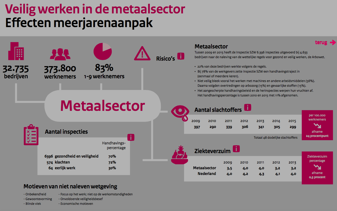 De metaalsector telde in 2015 32.735 bedrijven. Hiervan zijn er ruim 4600 geïnspecteerd. Het aantal werknemers bedroeg in 2015 ca. 373.800. Dit is 4,8% van alle werknemers in Nederland. De sector kenmerkt zich door een groot aandeel kleine bedrijven, zo heeft 83% tussen de 1-9 werknemers. Werken met machines en in aanraking komen met gevaarlijke stoffen zoals lasrook zijn belangrijke risico’s in de sector. Het gegeven van forse arborisico’s in combinatie met een lage naleving in de bedrijven (in 2010 bedroeg het handhavingsperctentage 81%) en het hoge aantal ongevallen, is voor de Inspectie SZW aanleiding geweest om in 2009 een meerjarig programma in deze sector te starten.
