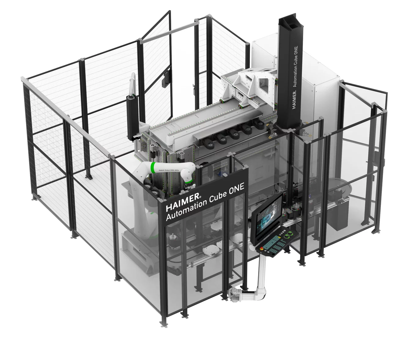 De Haimer Automation Cube One is een robotcel die is gebouwd als een solide is een gereedschapsmachine en wordt aangestuurd door de nieuwste Siemens Sinumerik One CNC. De Cube verwerkt het krimpen en ontkrimpen en het meten van complete gereedschappen automatisch en kan tegelijkertijd tot drie verschillende gereedschapsinterfaces beheren. Er zijn tot elf assen beschikbaar voor het hanteren van onderdelen. “Onze Automation Cube One kan een gereedschap in een kwestie van minuten verkleinen en ontkrimpen, het meten en de gegevens overbrengen naar de machine en databases”, benadrukt Andreas Haimer. Vergeleken met het prototype dat vorig jaar werd gepresenteerd, is de Automation Cube ook uitgerust met meettechnologie en sensoren, waardoor hij in staat is om extra meettaken uit te voeren.