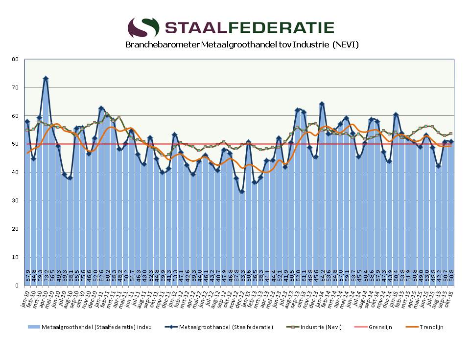 * Opmerkingen grafiek: Een score hoger dan 50 betekent ‘groei’. De relatieve vlakheid van de Nevi-lijn is te verklaren met de grote verscheidenheid aan industrieën waaruit deze is opgebouwd. De trendlijn (voor de Metaalgroothandel) toont het gemiddelde van de afgelopen 6 maanden.