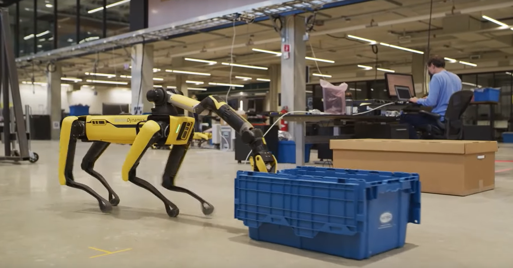 Met Spot Arm is er een armverlenging. De koddige video laat drie ‘spots’ zien die bij elkaar komen om gezellig te touwtjespringen. Maar met Spot Arm geeft Spot ontstaan ook meer functionele kwaliteiten – met name het grijpen en dragen van voorwerpen en zelfs het openen van deuren.