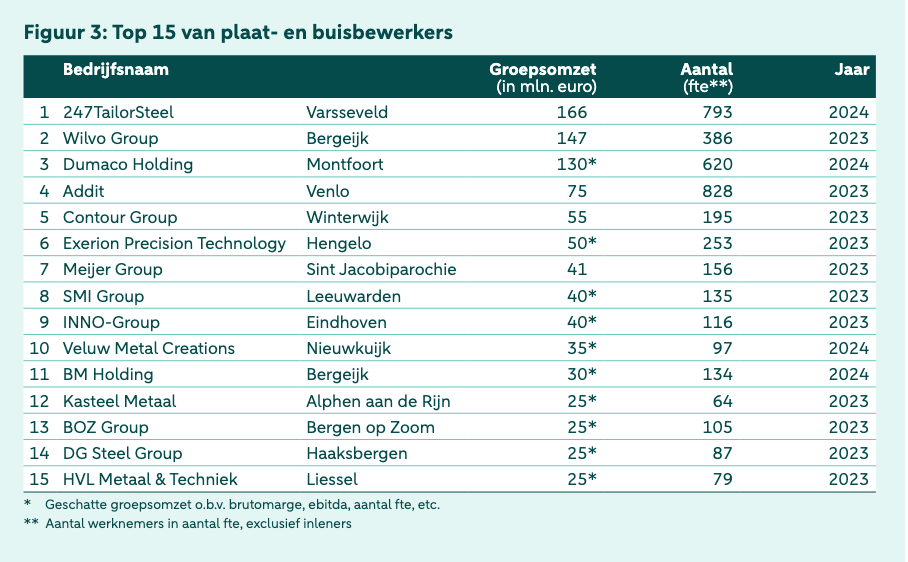 247TailorSteel, de Wilvo Groep en Dumaco Holding zijn de grootste plaat- en buisbewerkers van Nederland. Dat heeft ABN AMRO berekent op basis van de meest recente publieke jaarcijfers 2023 of 2024 en geschatte, geconsolideerde groepsomzetten. 247TailorSteel heeft een groepsomzet van 166 miljoen euro. Wilvo volgt met 147 miljoen euro en Dumaco sluit de topdrie af met een omzet van 130 miljoen euro.