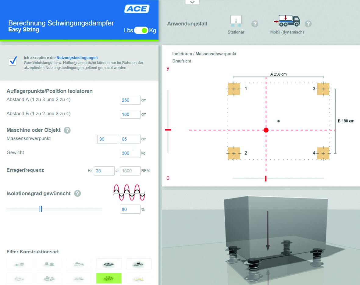 Na de invoer van een paar kerndata berekent het programma direct het massazwaartepunt van de machine en daarmee de individuele belasting per machinevoet, waarbij alle mogelijke oplossingen getoond worden. Robuuste machinevoeten, conuslagers voor voertuigcabines of vibratie-isolerende cup mounts: de innovatieve tool bepaalt binnen een paar seconden welke trillingsdemper van ACE het meest geschikt is. Uniek in deze branche is de volledig grafisch weergegeven gebruikersinterface die de trillingsdempers geplaatst onder de machine laat zien. Als interface voor de bepaling van de stoorfrequentie kan de door ACE ontwikkelde gratis app VibroChecker in combinatie met het nieuwe programma worden gebruikt, net als een filter waarmee kan worden bepaald of alleen afscheur zekere of standaardproducten berekend moeten worden.