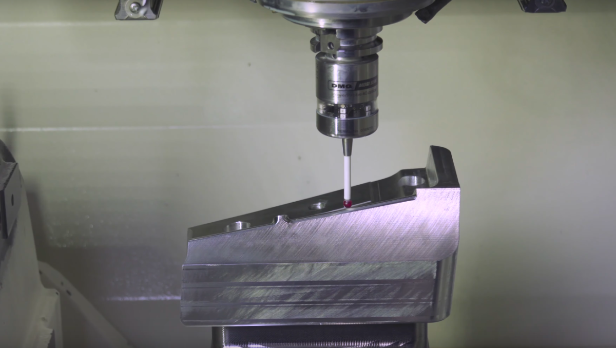 Een andere oplossing die kan worden gebruikt is een taster. De robot plaatst het product in de machine, meet met de taster de positie van het product na en het programma zal gecorrigeerd worden op de uiteindelijke positie. “Dit is bijvoorbeeld ook een heel handige werkmethode als u het product 6-zijdig wilt bewerken”, legt De Koning uit. “Dankzij de taster kan het product opnieuw worden uitgemeten en kan de tweede bewerking erg nauwkeurig worden uitgevoerd.”
