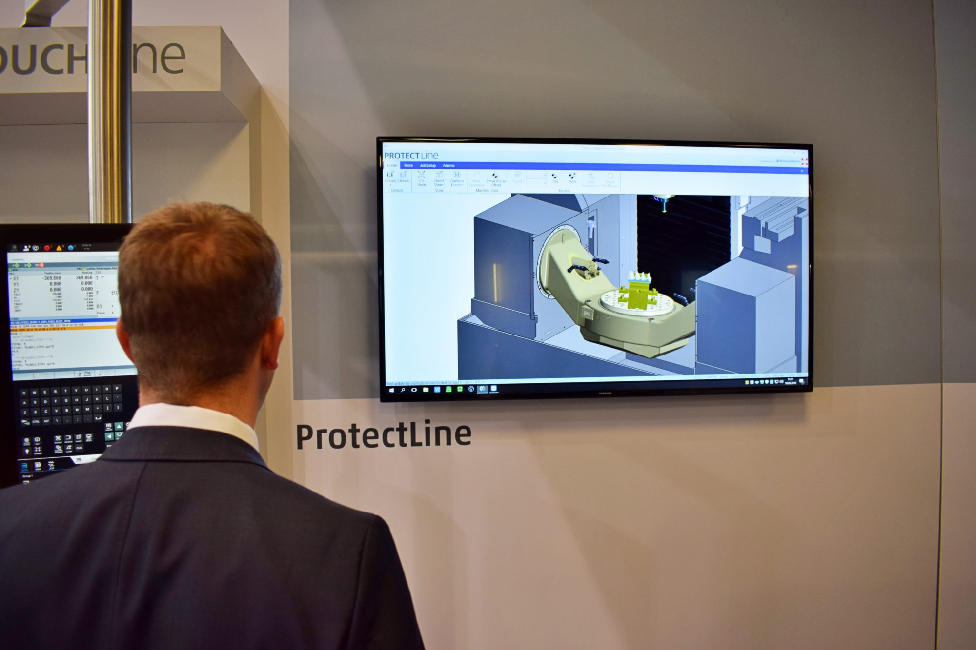 De softwareoplossing ProtectLine maakt gebruik van preventieve maatregelen ter bescherming tegen botsingen bij alle soorten bewerkingen. Om dit te bereiken, hebben de bewerkingscentra van de Chiron Group een digital twin die de echte machine volledig repliceert. Naast het bewerkingscentrum zijn alle bewerkingsgereedschappen, inclusief gereedschapshouders, en het werkstuk met klemopstelling in het model geïntegreerd. Verder valt ProtectLine op dankzij een automatische simulatie het werkstuk naarmate deze door bewerking van geometrie verandert. Dit betekent dat een virtueel bewerkingsproces parallel aan het echte bewerkingsproces plaatsvindt. Daarbij komt de geometrie van het virtuele werkstuk altijd overeen met die van het echte werkstuk. Tijdens het bewerkingsproces loopt de digitale twin in real-time voor op de echte machine en ondervindt eerst mogelijke botsingen. De echte machine wordt tijdig en gecontroleerd uitgeschakeld en is daarom preventief beschermd tegen een botsing.