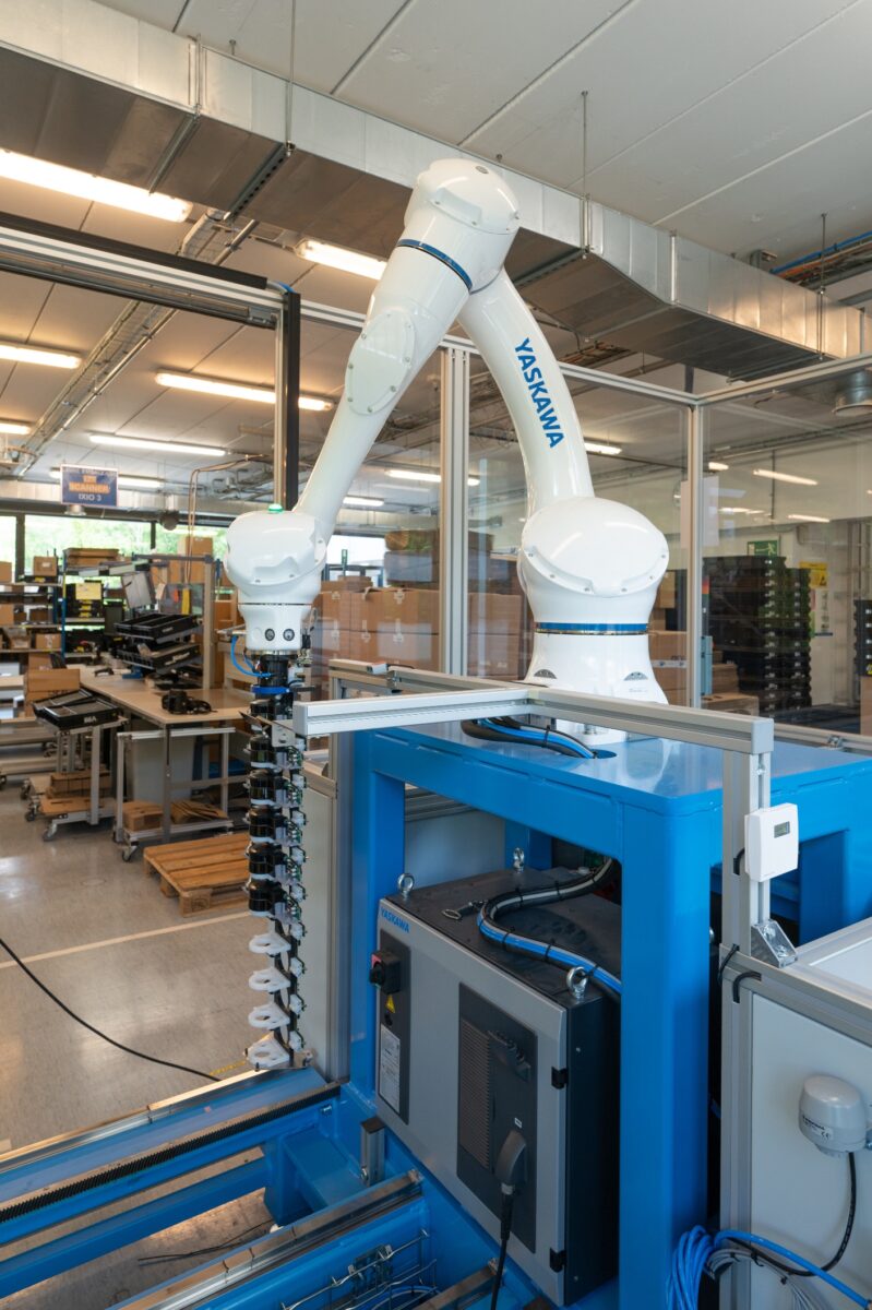Het team Industrialization bedacht daarom een nieuwe testopstelling. Waar ze in het verleden steevast voor specifieke, op het product afgestemde, installaties kozen, wilden ze het deze keer over een andere boeg gooien en de eigen productie future proof maken. “Het idee was om te werken met een robotcel voor kalibratie en kwaliteitsinspectie, die zich flexibel kan aanpassen aan de andere vorm en afmetingen van nieuwe en bestaande producten en 24/7 autonoom kan doorwerken.” Het hart van de cel moest een zesassige cobot worden met voldoende payload om ook op dat vlak de nodige flexibiliteit in huis te halen. Een zoektocht die hen al snel naar Yaskawa leidde want met zijn Motoman HC reeks zet het wat dat betreft de standaard in de cobotmarkt. “Ze hebben de grootste”, vertelt Gilles Bauduin, technical support en designer Industrialization, met een knipoog. “Bovendien wist ik uit ervaring bij mijn vorige werkgever hoe betrouwbaar ze werken.”