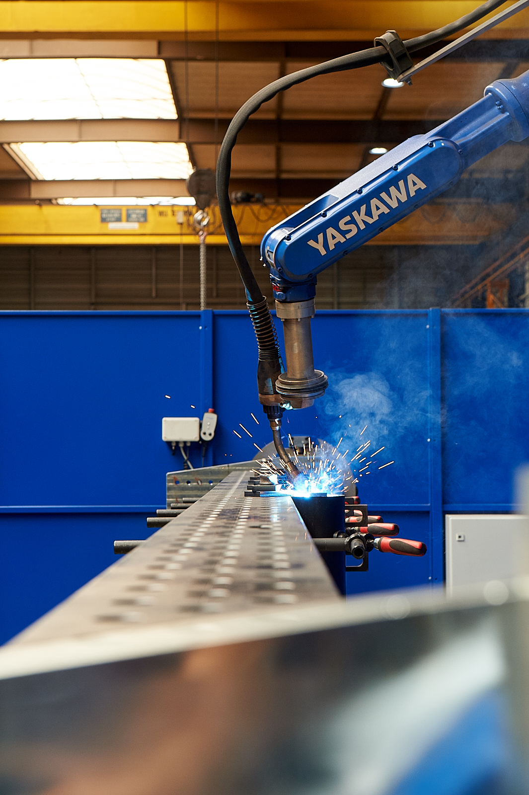 De installatie bestaat uit een MH50-20II Yaskawa Motoman lasrobot met een werkbereik van ruim 3.000mm welke staat gemonteerd op een, als externe as programmeerbare, track met een rijweg van 11.150mm. Het hiermee verkregen werkbereik van de robot is onderverdeeld in 3 werkstations; twee aan de voorzijde van de track en één aan de achterzijde van de track. In de twee voorste werkstations staan vrij programmeerbare 2 tons werkstukmanipulatoren met tegenlager opgesteld. De installatie is voorzien van een watergekoelde Fronius TPS500i lasinstallatie en een eveneens watergekoelde Robacta lastoorts. Deze stroombron is door middel van de WeldCom 2 interface probleemloos rechtstreeks vanuit de robot teach pendant programmeerbaar. De afgelopen maanden werd er door het automatiseringsteam van GB Steel Group, Vossebelt en Staalbouw Nauta gewerkt aan de voorbereidingen van de lasrobot. Hierbij ging de aandacht vooral uit naar het leren kennen van de techniek, programmeren en aftasten van de producten.