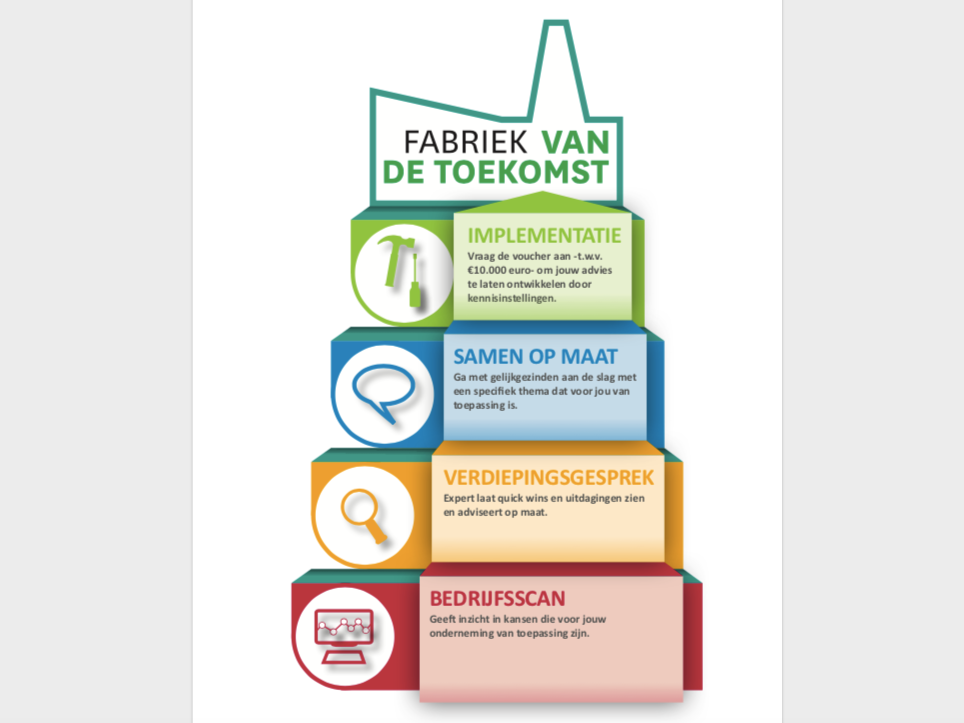 Na het invullen van de bedrijfsscan is het mogelijk om in contact te komen met een adviseur. Samen met de adviseur wordt dan gekeken waar je als bedrijf staat, waar je naar toe wil en welke technologieën daarbij passen. Op die manier is het mogelijk om een op maat gemaakt plan van aanpak samen te stellen, met daaropvolgend een haalbaarheidsstudie. Hiervoor is een voucher van 10.000 euro beschikbaar. Deze aanpak is gratis voor mkb-ondernemers gevestigd in Zuid Nederland.