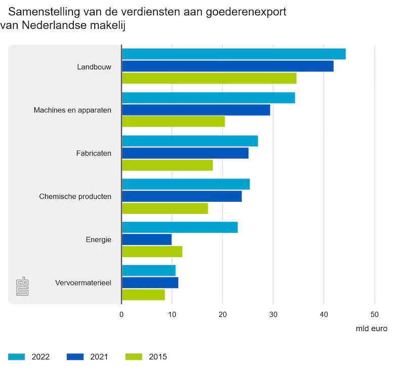 Machines en machineonderdelen zijn Nederlands grootste exportproduct, blijkt uit cijfers gepubliceerd door het CBS. Ons land verdiende in 2022 zo’n 25,5 miljard euro aan de uitvoer van machines, meer dan een verdubbeling ten opzichte van 2015. Daarna volgen aardgas (12,0 miljard euro) en metaal- en metaalproducten (8,1 miljard euro). De totale verdiensten van Nederland aan de goederenexport van Nederlandse makelij bedroegen 165,3 miljard euro in 2022, oftewel 17,2 procent van het bbp.