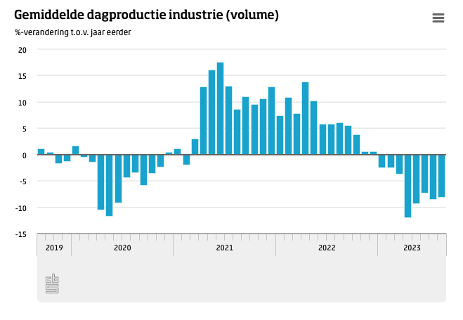 De gemiddelde dagproductie van de Nederlandse industrie was in augustus 8,0 procent lager dan in augustus 2022, maakt het CBS bekend. Ook in de voorgaande maanden van 2023 kromp de productie op jaarbasis.