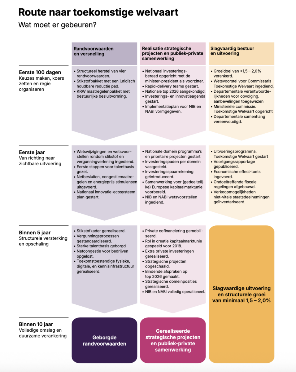 De routekaart in het rapport schetst een gefaseerde aanpak. In de eerste 100 dagen moeten keuzes worden gemaakt, de koers worden vastgezet en regie worden georganiseerd. In het eerste jaar verschuift de focus van richting naar zichtbare uitvoering. Binnen vijf jaar volgt structurele versterking en opschaling van strategische projecten, en binnen tien jaar moet sprake zijn van een volledige omslag en duurzame verankering van groei, investeringen en bestuur.