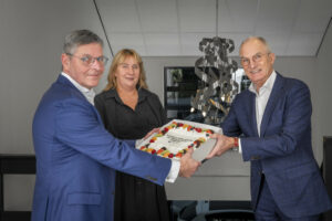 Met de overhandiging van een speciale taart door Koninklijke Metaalunievoorzitter Fried Kaanen aan Ardi Schrama en Marjo Puttock (directeuren van …