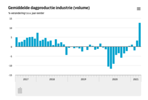 De gemiddelde dagproductie van de Nederlandse industrie was in april 12,7 procent hoger dan in april 2020, maakt het CBS …