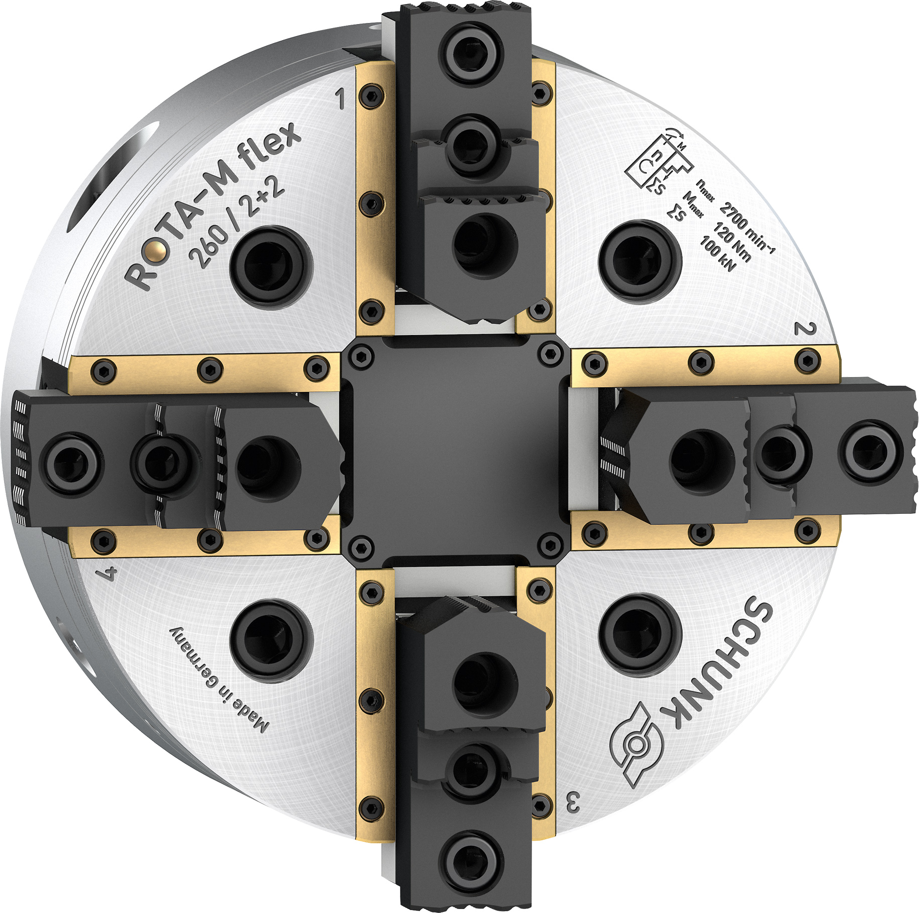 Vanaf maat 800 profiteren gebruikers ook van een gewichtsbesparend ontwerp. De klauwplaat is voorzien van groeven en dankzij de vaste aanslagen kan de klauwplaat ook als spanner worden gebruikt. Bovendien zijn de grote maten ook geschikt om op verticale draaibanken te gebruiken. De Schunk ROTA-M flex 2+2 is uitgerust met een flexibele vertanding (1,5 mm x 60° of 1/16″ x 90°).