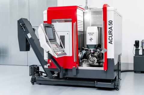 Zo staat niets de uitstekende bewerking van kleine werkstukken in de weg. Iets grotere bewerkingen zijn ook mogelijk, want de draai/zwenktafel heeft afmetingen van 500 x 430 mm en kan gewichten tot 300 kg dragen. Ook het assenbereik is hierop voorzien, aangezien de Acura 50 zowel 500 mm in de X-as als Y- en Z-richting van een royale 550 mm mogelijk zijn, en dit met een afmeting van slechts 2088 mm x 2616 mm, oftewel een vloeroppervlakte van ca. 5,5 m². Door de zeer geringe totale hoogte en de geringe inbouwdiepte kan het nieuwe bewerkingscentrum in bijna elke productielijn worden gebruikt.