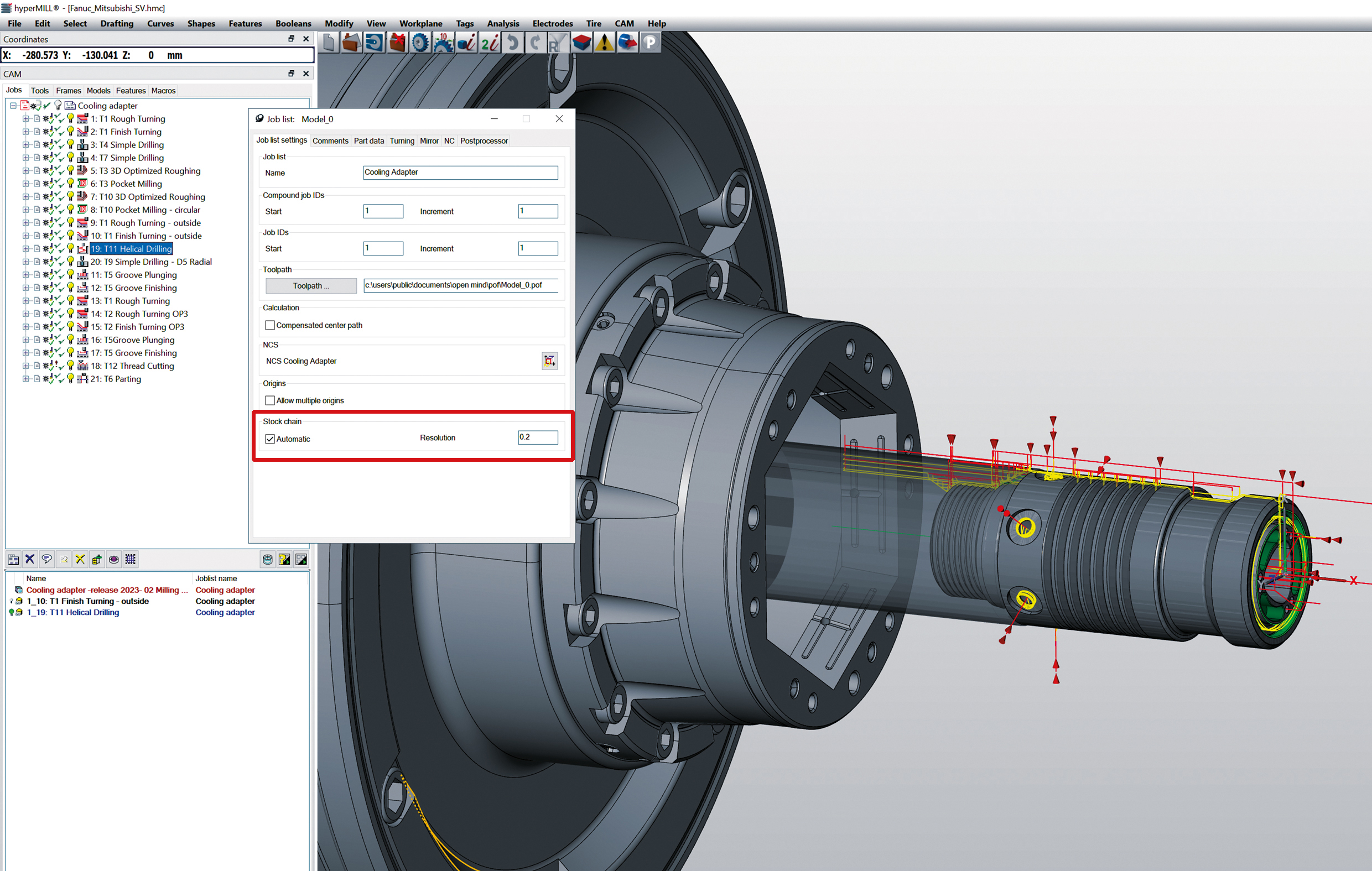 De nieuwe automatische ruwmateriaalketen biedt zekerheid, vooral bij het wisselen tussen draai- en freesbewerkingen of andere projecten met een groot aantal processtappen. Hypermill creëert alle voorraad automatisch en in de juiste volgorde, zelfs als de opdrachtvolgorde is gewijzigd.