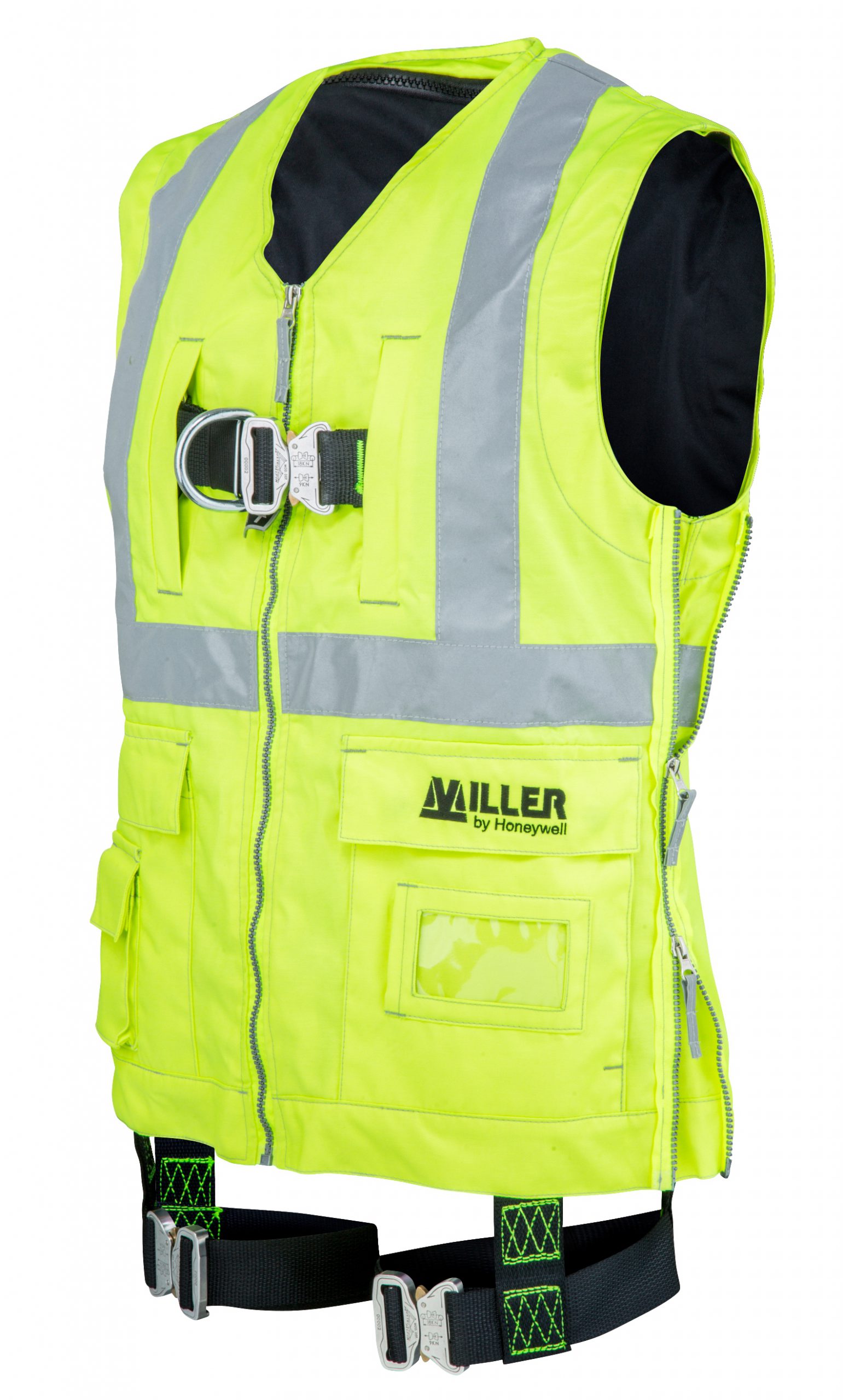 Kleding, rugtassen of materialen over een veiligheidvest dragen is in veel situaties niet toegestaan. Toch wordt het in de praktijk wel gedaan, want onder een vest kunnen de ringen van een harnas niet worden gebruikt. Het nadeel is dat de zichtbaarheid belemmerd wordt. Het Miller veiligheidsvest biedt dan een oplossing. De serie Miller H-design harnassen geeft voldoende bewegingsvrijheid en comfort. Het harnas kan worden gebruikt in o.a. de bouw, (petro)chemie en besloten ruimten. Door een grote ritssluiting aan de binnenzijde is de voering van het vest te openen zodat het harnas volledig kan worden geïntegreerd in het vest. Via de openingen aan de voor- en achterzijde zijn de koppelpunten van het valharnas te gebruiken met externe vallijnen en valblokken. Doordat het vest afneembaar is kan deze eenvoudig worden vervangen of gewassen. Met maar liefst vijf zakken kan gereedschap en accessoires veilig worden meegenomen. Daarnaast is een kaarthouder geïntegreerd voor ID-kaarten.