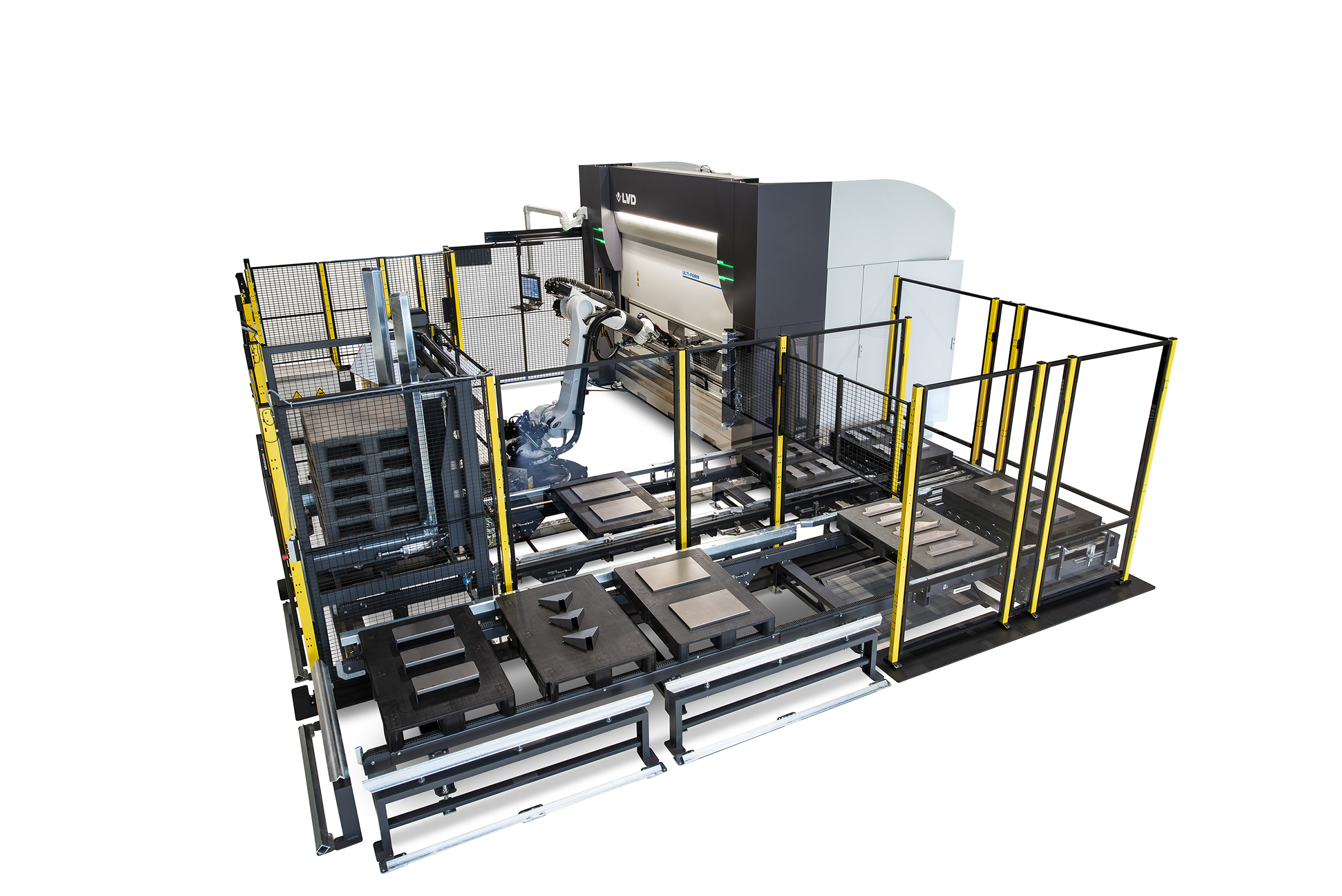 Ulti-Form combineert een kantbank met 135 ton drukkracht met ingebouwde gereedschapswisselaar en een industriële robot. De cel buigt stukken van 50 x 100 mm tot 1200 x 800 mm, met een gewicht tot 25 kg.