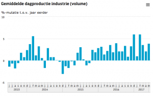 De gemiddelde dagproductie van de Nederlandse industrie was in mei 3,9 procent hoger dan in mei 2016, maakt het CBS …